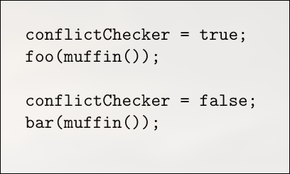 While you can trace the logic in a trivial example, the complexity quickly becomes unmanageable as the build script grows with more functions, variables, and if/else branches. It's important to note that this isn't just a problem with global variables. Even if conflictChecker were a property of a muffin object, you would still need to track the program's execution step-by-step to understand the object's state when muffin() is called, which makes the whole build process hard to reason about :(