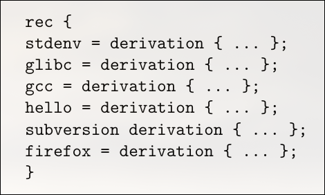 Ok so a way to solve this would be to use a lazy language A key feature of a lazy language is that it only computes a value at the exact moment it's needed. This property is incredibly powerful for a language used to describe software packages and systems.