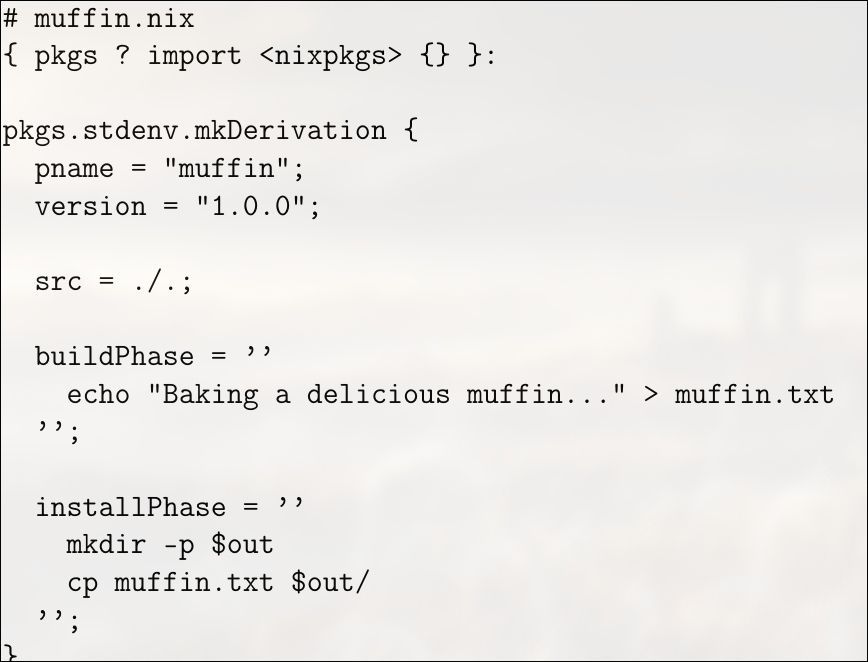 The first line, { pkgs ? import , defines a function that takes an argument named pkgs, which by default is set to the result of importing . This gives the expression access to the standard Nix package set, allowing the use of common utilities and build functions. The next expression, pkgs.stdenv.mkDerivation { ... }, declares a derivation, which is a build recipe describing how to construct a package. Inside this derivation, the attributes pname = "muffin"; and version = "1.0.0"; specify the package name and version. The src = ./.; line indicates that the source files for the package are located in the current directory, i.e., the same directory as the .nix file itself. The buildPhase section is a shell script that runs during the build process; in this case, it simply creates a file named muffin.txt containing the message “Baking a delicious muffin…”.